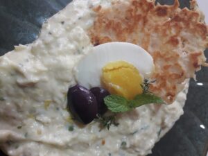 7 – Sirva com metade de 1 ovo cozido, azeitonas, raspas da casca do limão e tuile de parmesão.
