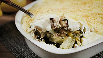 Em uma travessa, disponha metade do purê, a tilápia, o requeijão cremoso, a outra metade do purê de batata e, por último, salpique queijo parmesão ralado. Leve para gratinar.