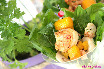 Em outra frigideira, colocar 4 colheres de sopa de azeite de oliva, 3 colheres de sopa de suco de limão siciliano, raspa de limão e pimenta dedo de moça. Grelhar os camarões. Cortar dois dos camarões em pedacinhos. Arrumar nas taças as folhas de rúcula, colocar as fatias de cogumelo e por cima um camarão picado e a manga. Cobrir com o molho por cima. Em um palito comprido, colocar um cubo de manga grelhada, um camarão inteiro e outro cubo de manga grelhada. Colocar dentro da taça e servir.