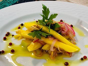 Monte a salada com a manga, cebola e amêndoas. Tempere com limão, sal e azeite. Decore com salsa e pimenta rosa (opcional).