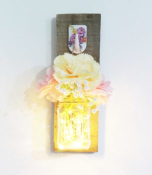 Agora é a hora da finalização da sua peça. Use um fio de luzes (do tipo pisca pisca) e coloque-o dentro do pote de vidro. Depois, coloque as flores artificiais por cima.