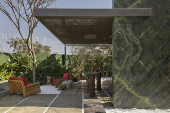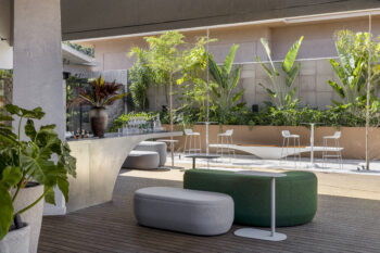 O conceito segue no espaço Entre encontros por Necta, de Rafael Granero. O arquiteto coloca em prática seu pragmatismo para apresentar um ambiente múltiplo, com um layout que permite diversos tipos de uso de acordo com a dinâmica necessária e a demanda dos usuários. Dentro desse contexto, o paisagismo não poderia ficar de fora. O trabalho, feito pela paisagista Mônica Costa, complementa e valoriza o trabalho com mais significado e afetividade.