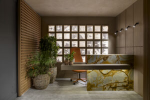 Outro cenário que ganha vida, autenticidade e leveza com o verde é a Recepção/Bilheteria, do arquiteto Ricardo Dorascenzi. Euforbias, que evocam a estética dos cactos, são protagonistas, oferecendo um toque contemporâneo e orgânico ao ambiente. A variação nas folhagens, em vasos vietnamitas e peças artesanais do nordeste brasileiro, intensifica a sensação de frescor e naturalidade. “O verde exuberante encontra a sofisticação dos materiais ripados e dos muxarabis, criando um jogo dinâmico que mescla o rústico e o refinado”, pontua Dorascenzi.