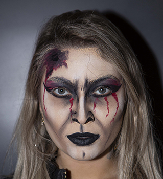 Nos lábios fizemos uma mistura desse mesmo batom e algumas sombras, aqui a ideia era deixar o look menos marcado mas sim criar uma imagem de morto vivo com os contrastes de cores.”