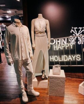 Já na John John, o branco continua como o queridinho da coleção de Réveillon, mas este ano as peças também ganharam versões nas cores off-white, cinza e bege, em visuais tom sobre tom. Entre os destaques de looks estão longos elaborados com recortes, transparências e brilhos que são a cara da virada, além de vestidos e outras peças com paetês em propostas mais festivas e com modelagens assimétricas.