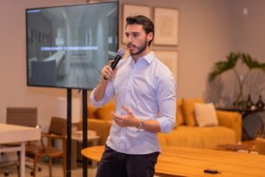 Durante sua apresentação, o arquiteto contou sobre sua trajetória profissional, iniciada aos 17 anos, e compartilhou estratégias, adversidades e projetos que o levaram a ser o arquiteto mais jovem rankeado na conceituada lista Forbes Under 30, em 2023.